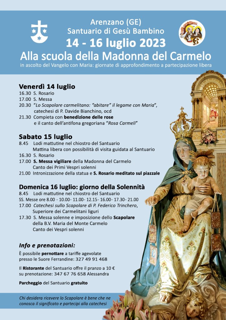 Per chi vorrà e potrà, vi segnaliamo che è possibile partecipare presso il nostro Santuario di Gesù Bambino ad Arenzano (GE) alle celebrazioni e catechesi che si terranno dal 14 al 16 luglio. Nella locandina sono indicati tutti gli orari, e i recapiti per informazioni e prenotazioni (anche per l’alloggio e i pasti).