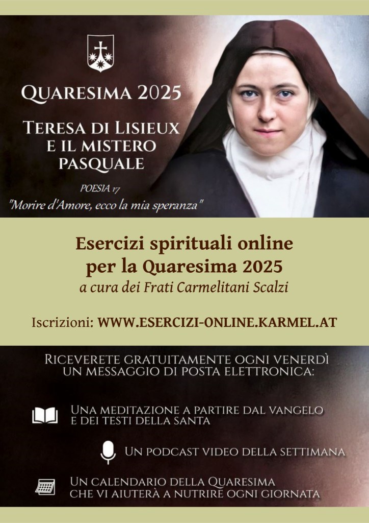 Come ogni anno, i frati Carmelitani propongono gli Esercizi spirituali online per la Quaresima. Questa volta, è stata scelta come figura di riferimento Santa Teresina di Gesù Bambino (di Lisieux), nell’anno centenario della sua canonizzazione (1925), che ci accompagnerà nelle meditazioni per ogni settimana con un suo pensiero.